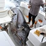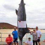 It took them 15 minutes to get her to the boat after she took a Moyes XL Pusherman. The fish has a 154” Short, 78” Girth and a 19.5 ” Tail. She was thick all the way through though with an 82” Girth at the anal fin.